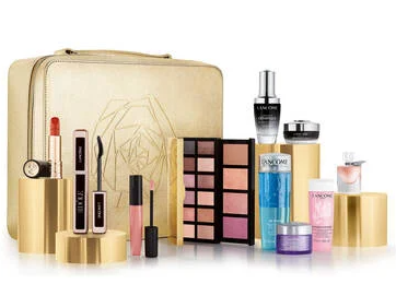 The Holiday Beauty Box Includes 8 Full-Size items in a luxurious gold vanity case created with 100% recycled materials and imprinted with the original Lancôme Orlinski Rose.