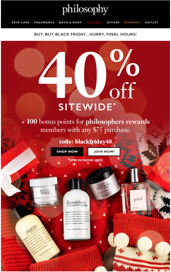 • Black Friday Is Here! Philosophys Biggest Sale Of The Year: 40% Off Sitewide at Philosophy! Use Code 40off. Valid 11/26-11/27.