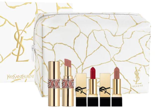 A lipstick set with a makeup pouch, Rouge Volupte Shine Lipstick Balm for a high-shine, pink nude lip and Mini Rouge Pur Couture Satin Lipsticks in nude & red shades.